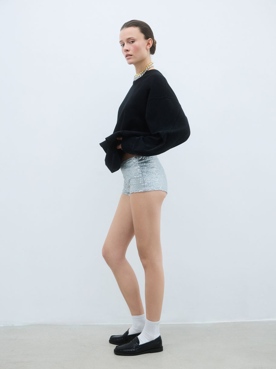 These ultra-short fitted shorts feature a high-shine sequin finish for maximum visual impact. Designed with clean seams and a sculpting silhouette, they’re fully lined with a soft-touch interior that feels smooth against the skin—offering both statement and comfort in one.