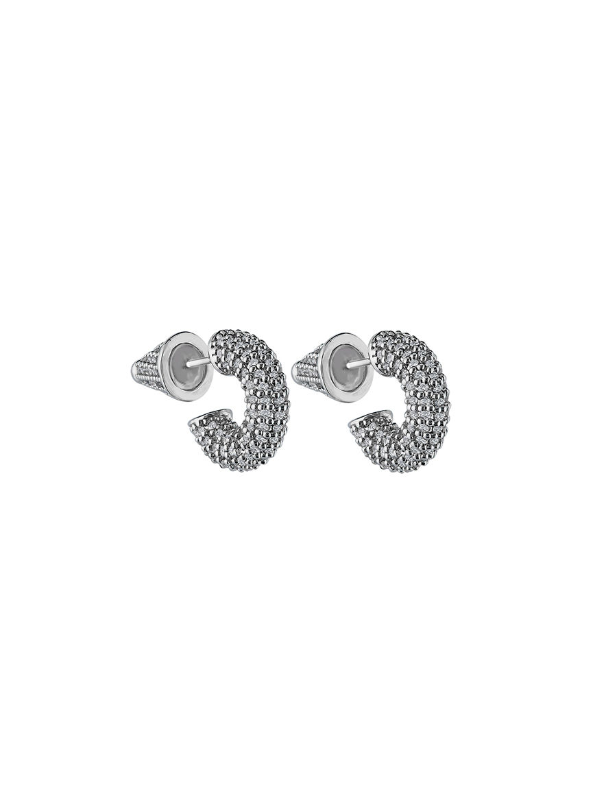 The smallest member of the Parvin earring trio, this hoop brings bold texture in a compact, wearable scale. Fully encrusted in micro zircons, it delivers maximum shine in minimal space.