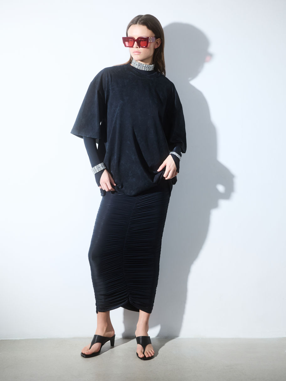A relaxed essential reimagined with an attitude. This oversized black T-shirt features a subtle acid-wash finish that gives the piece a washed-out, almost vintage character. Crafted from soft cotton for all-day ease, it effortlessly blends comfort with a street-smart edge. Whether styled solo or layered over a cut-out bodysuit, it adapts to both casual and elevated looks.